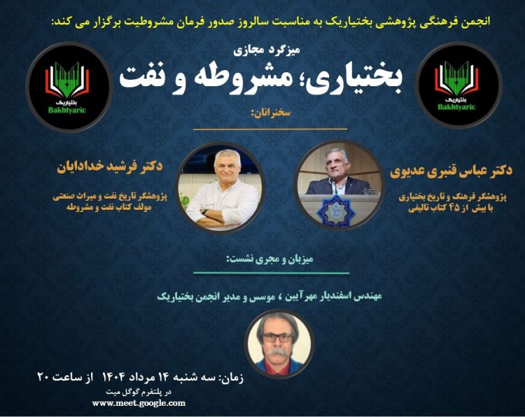 به گزارش حاشیه خبر، در این میزگرد مجازی که در پلتفرم “گوگل میت” و از ساعت هشت شب سه شنبه، چهاردهم امرداد۱۴۰۴(به وقت ایران) برگزار می شود، دکتر عباس قنبری عدیوی، استاد دانشگاه و پژوهشگر برجسته حوزه فرهنگ، ادبیات و تاریخ بختیاری و رئیس بنیاد ایرانشناسی چهارمحال و بختیاری و مولف بیش از چهل و پنج کتاب در زمینه فرهنگ، فولکلور و تاریخ بختیاری و مدیر انتشارات “نیوشه”، در زمینه حضور تاثیرگذار بختیاری ها در جنبش مشروطه سخنرانی خواهد کرد.