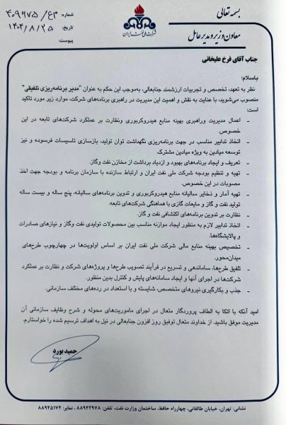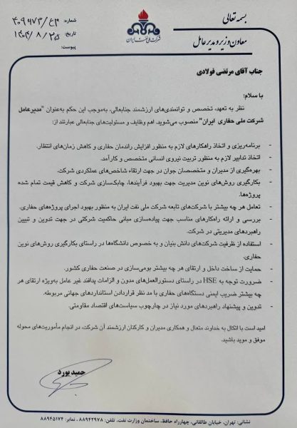 🔸️ مرتضی فولادی جایگزین مهران مکوندی در شرکت ملی حفاری ایران شد و فرخ علیخانی که تا امروز مدیر نظارت بر تولید شرکت ملی نفت ایران بود به عنوان مدیربرنامه ریزی تلفیقی این شرکت جایگزین رامین حاتمی شد.