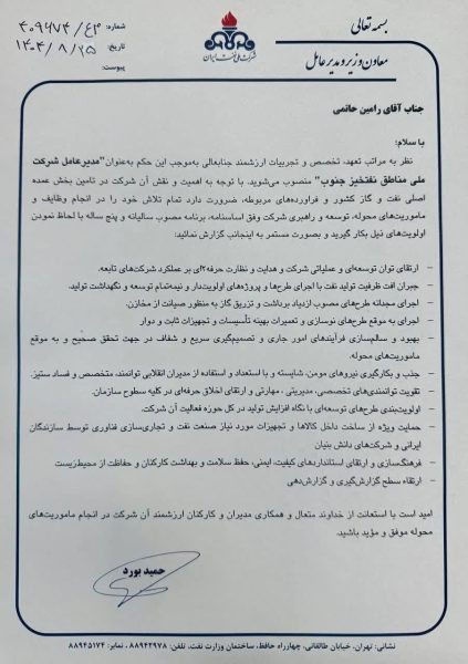 بدین ترتیب و در این احکام، رامین حاتمی مدیر سابق برنامهریزی تلفیقی شرکت ملی نفت ایران جایگزین ابراهیم پیرامون گردید.