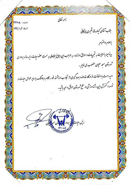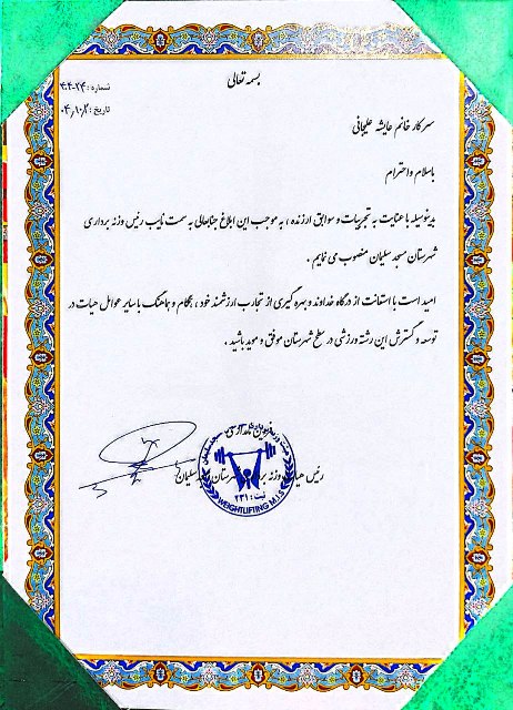 🔹به گزارش حاشیه خبر به نقل از روابط عمومی هیأت وزنه برداری مسجدسلیمان، فردین نامداری در این احکام آقای کیامرث قنبری را به عنوان عضو هیأت رییسه و خانم عایشه علیجانی را به عنوان نایب رییس بانوان این هیأت منصوب و احکام انتصاب را با حضور رییس اداره ورزش و جوانان شهرستان به آنها اعطاء نمود.