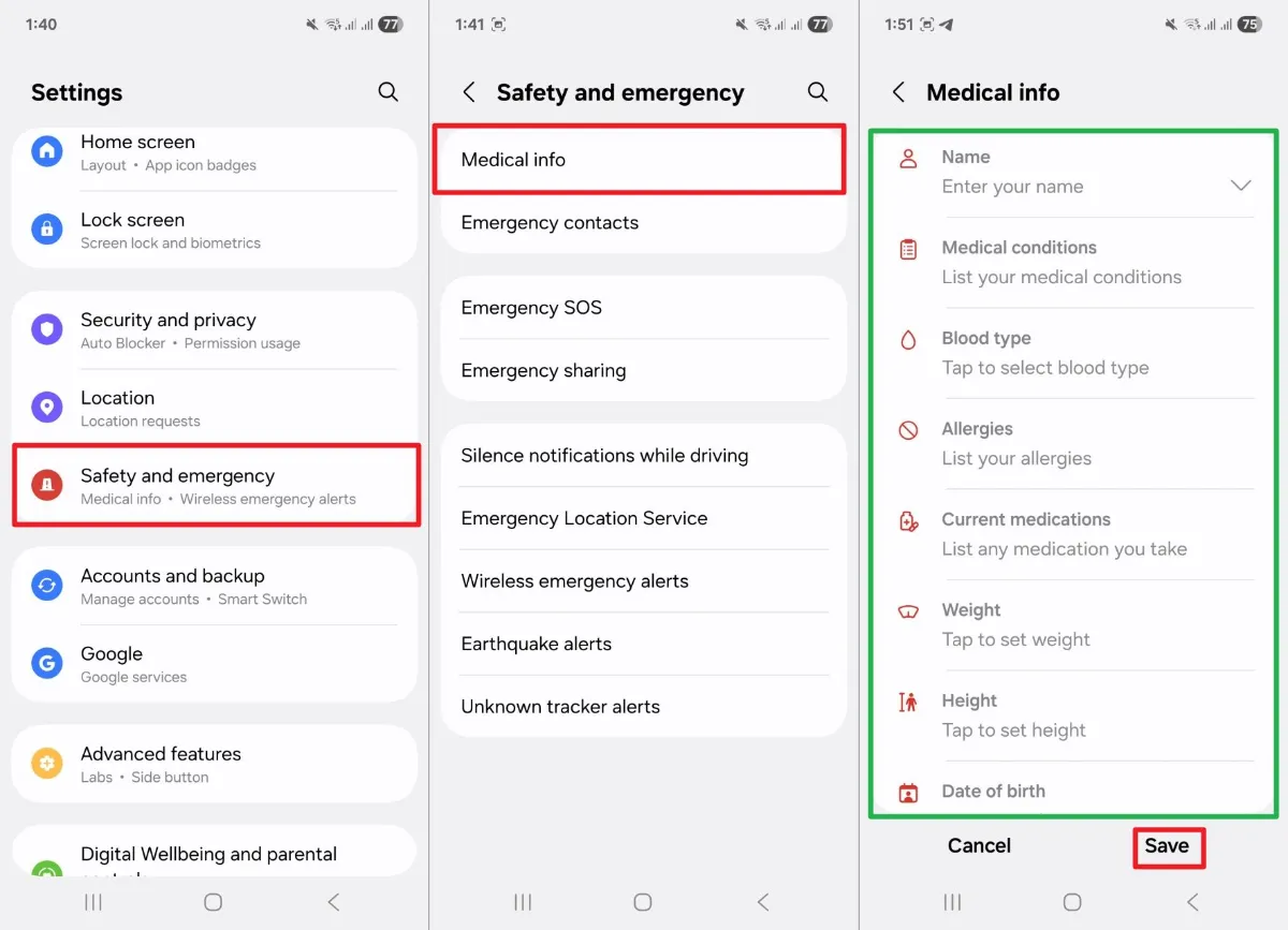 اندروید در نسخههای جدید خود ساختاری نسبتاً یکپارچه تحت عنوان «Safety & Emergency» برای ثبت اطلاعات پزشکی و اضطراری ارائه میدهد. البته مسیر دسترسی به این قابلیت در برندهای مختلف ممکن است اندکی متفاوت باشد. در تمام مدلها، هدف یکسان است: ثبت اطلاعاتی که در صفحهی قفل و بدون نیاز به باز کردن گوشی در دسترس امدادگران قرار گیرد.